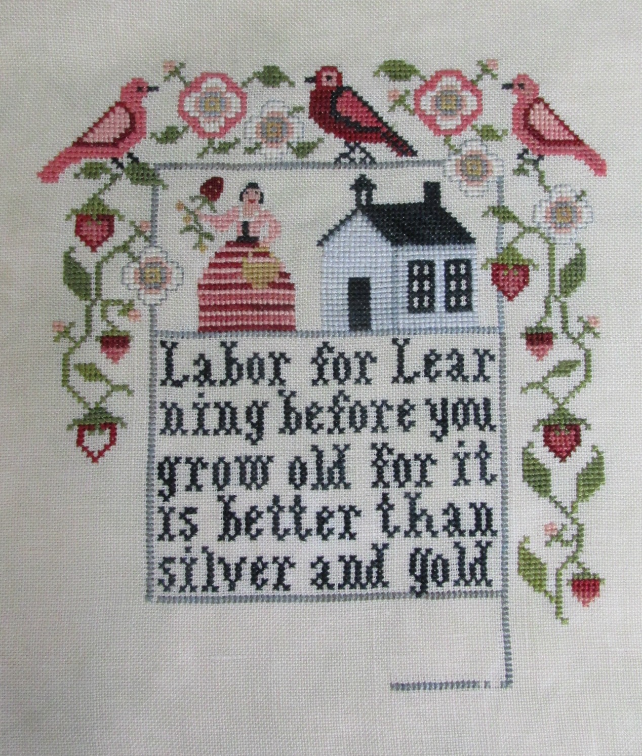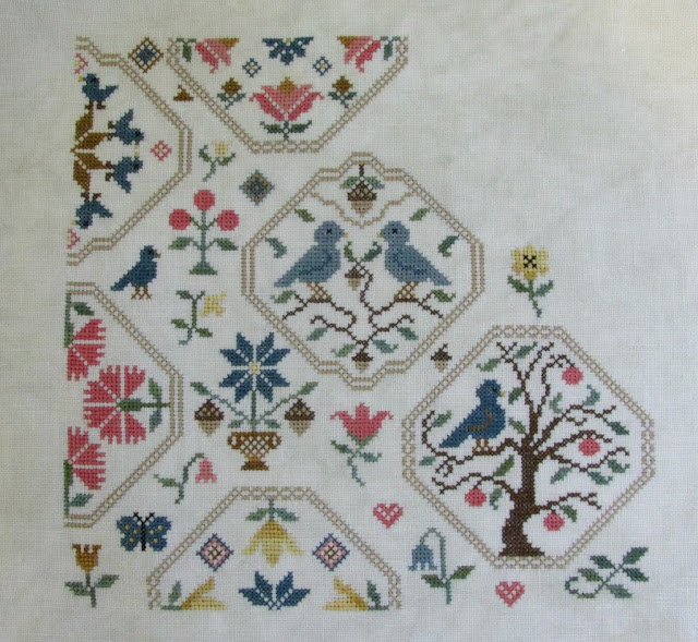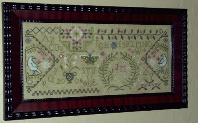 I'm doing an SAL with a cyber-friend and it's going well. This sampler is from the Blackbird Designs "Joyeux Noel" book. I've wanted to stitch this sampler for years so I'm glad to finally get it done . I just have the bottom part and border to finish. I changed a lot on this sampler.....I substituted several of the colors and as I went along I stopped following the colors on the chart and just made things whatever color I wanted. The book says this was charted from an antique sampler and there were lots of missing letters, letters out of sequence, etc. I added in some of the missing letters and corrected the letter sequence...I just can't leave things alone but I cause myself a lot of extra work! Here's my progress: