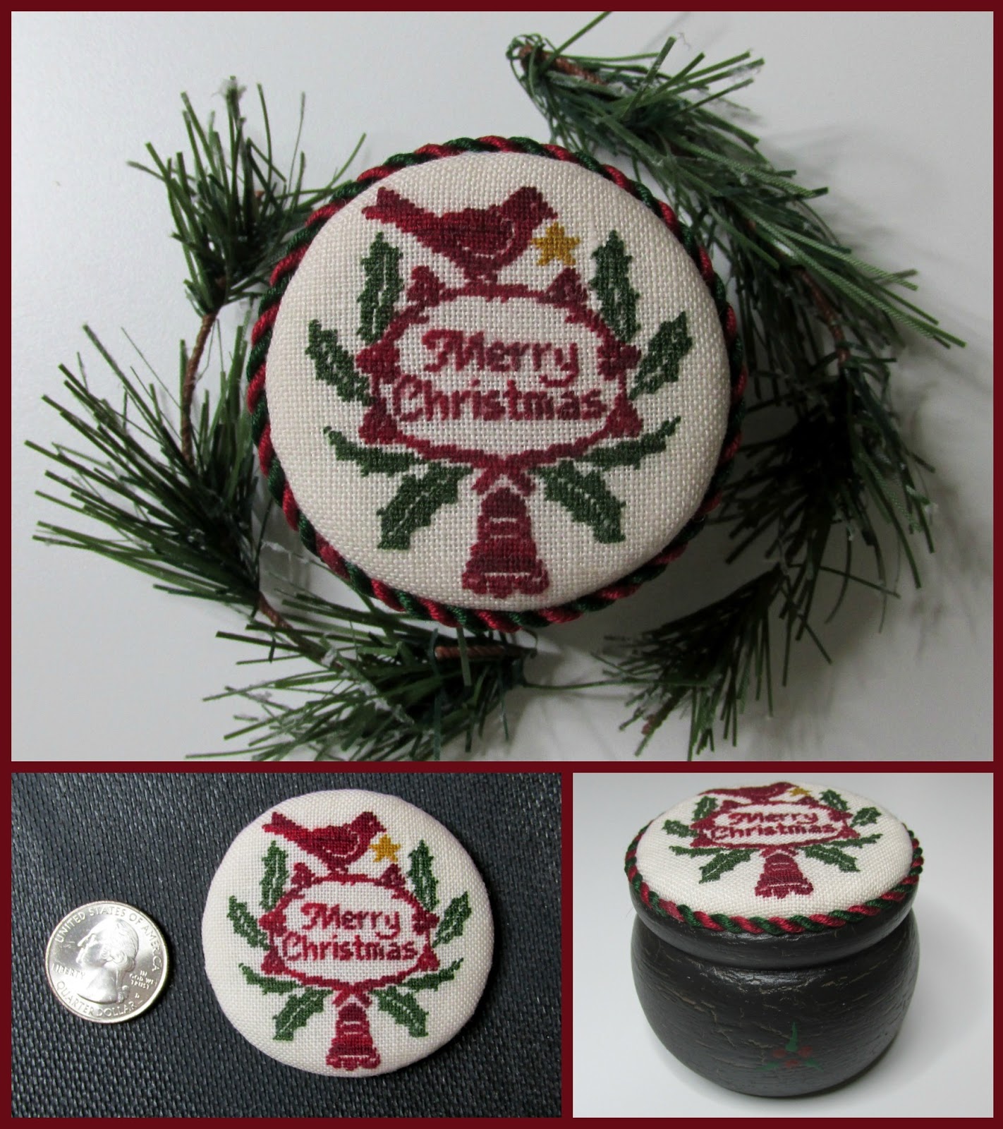 And speaking of finishing, below are some photos of what I did with one of the Little House Needlework ornament patterns. A dear friend gave me this wooden spindle from Bloom Woodworks. It's a great way to display small pieces. I sew a little sleeve on the backing fabric before I put it all together and that holds it on the spindle. I have so much Christmas stuff but I just can't stop making more!