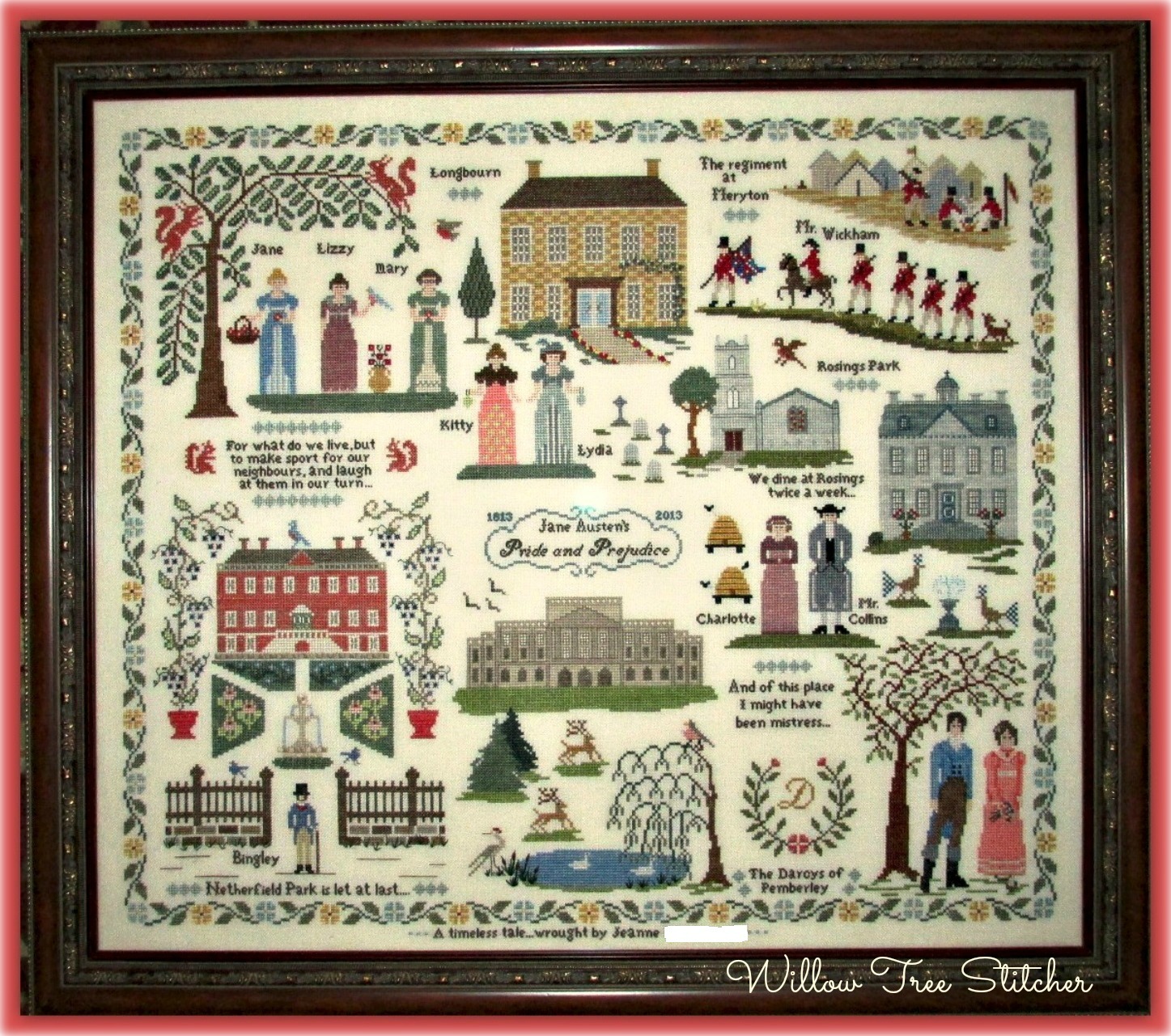 Lizzy & Darcy in lower right corner - from "Pride & Prejudice Sampler" by West Wind Designs. This designer still has a site on Etsy with many nice designs inspired by Pride & Prejudice. Westwind Designs on Etsy The tree that Darcy & Lizzy are standing under was inspired by the tree on "Red House Sampler" by The Sampler Company/Brenda Keyes.